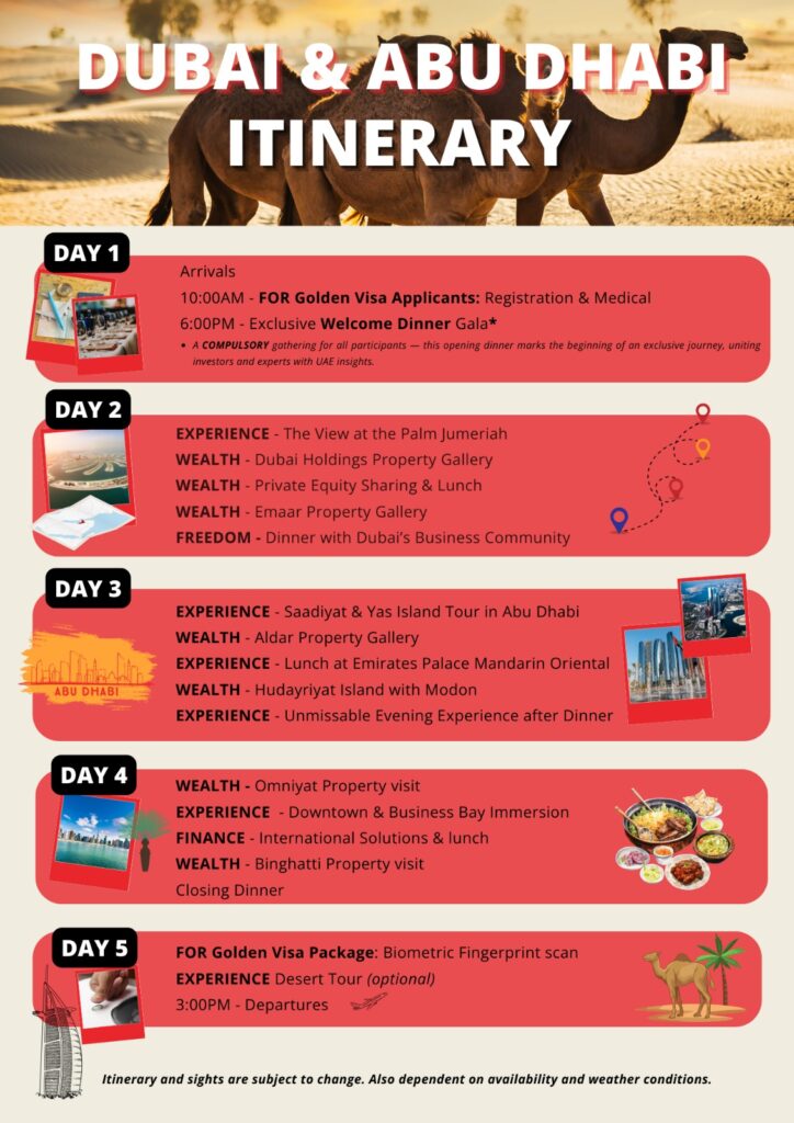 Join us for a once in a lifetime experience in UAE for Sightseeing, Business Expansion, and Property Tour. Discover property, business tax & family benefits for High Networth Individuals (HNWIs) and the chance to obtain one of the world’s most sought-after Golden VISA.